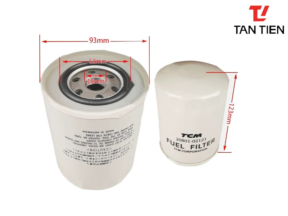 Bộ lọc dầu 20801-02121 có kích thước 123x93x18mm là bộ lọc dầu nhiên liệu Diesel dùng cho xe nâng TCM 3.5-5 tấn dòng T8, Z8 và T9.