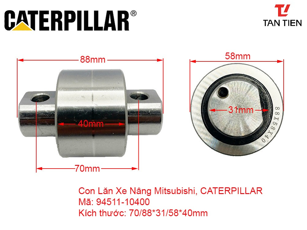 Con Lăn Xe Nâng CATERPILLAR 94511-10400 có kích thước 70/88*31/58*40mm là con lăn khung nâng chuyên dùng trên xe nâng Mitsubishi FD70NH , Caterpillar DP70
