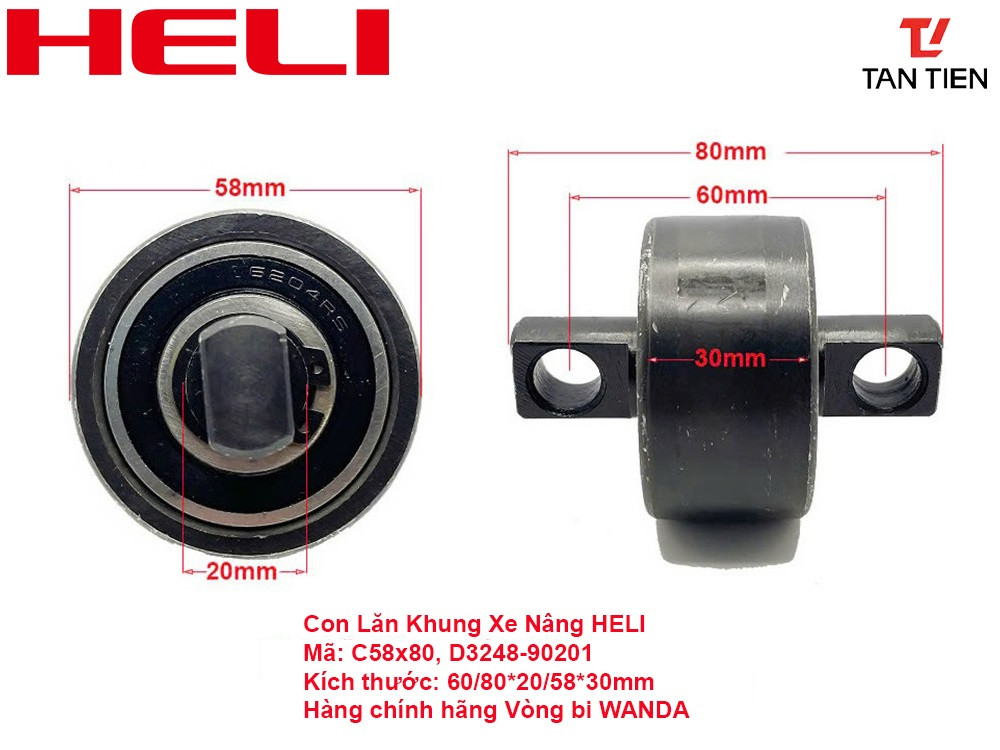 Con Lăn Xe Nâng HELI C58x80, D3248-90201 có kích thước 60/80*20/58*30 mm là con lăn khung nâng chuyên dụng trên xe nâng HELI 5 tấn dòng K2 Series CPC(D)50
