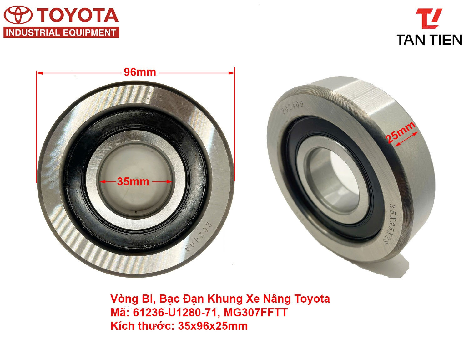 Vòng Bi 61236-U1280-71, 61237-U1280-71, 61238-U1280-71, MG307FFTT có kích thước 35x96x25mm là bạc đạn khung càng xe nâng Toyota 1-1.8 tấn dòng 62-8FDU15, 62-8FDU18, 8FDU15, 8FDU18, 8FGU15