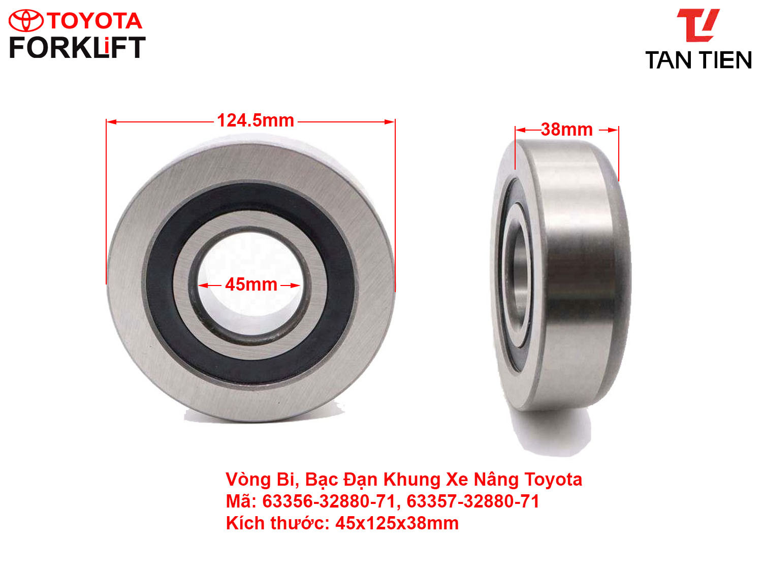 Vòng Bi Toyota 63356-32880-71, 63357-32880-71, MG309T14 có kích thước 45x124.5x38 mm là bạc đạn khung nâng chuyên dụng trên xe Toyota 7~8FD40