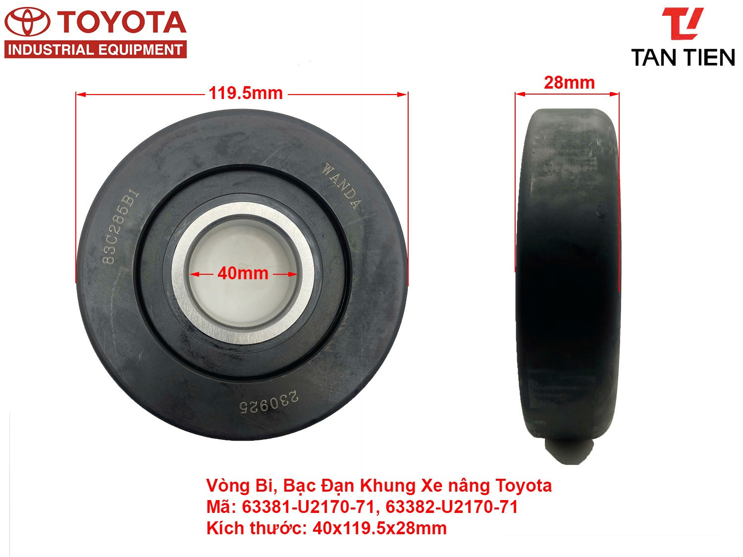 Vòng Bi Toyota 63381-U2170-71, 63382-23420-71, 61236-23601-71, 63382-U2170-71, MG308T-18, 830065-IBI kích thước 40x119.5x28mm là bạc đạn khung càng xe nâng Toyota 7-8F20~30 , 4Y, 1DZ